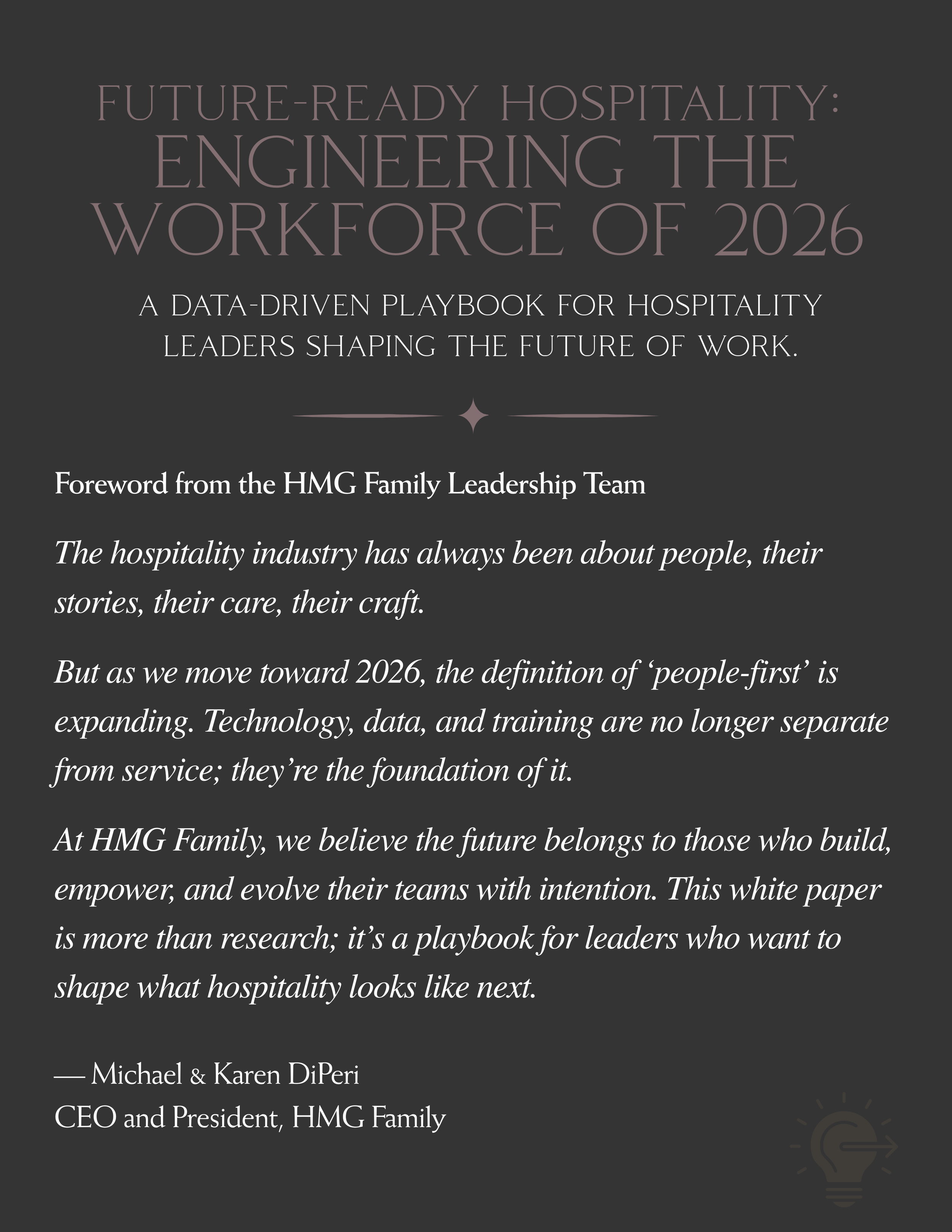 In this white paper, HMG Family shares exclusive data, industry benchmarks, and a 90-day plan to help hospitality leaders engineer a future-ready workforce.